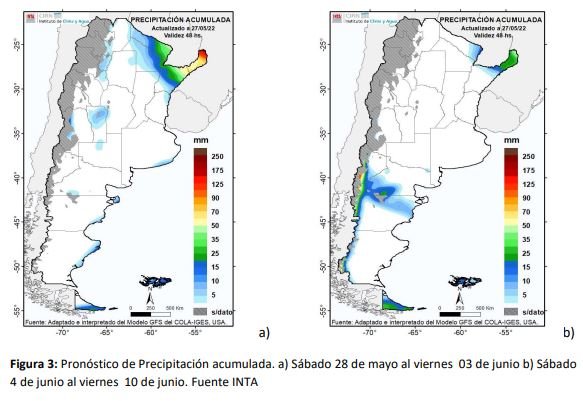 En tanto el balance de agua en el suelo, publicado en el informe Agrometeorológico semanal del INTA el día 27 de mayo (figura 2), destaca que para la región el perfil edáfico se encuentra con un 50-60% de Agua útil, entendiendo por agua útil a la lámina de agua aprovechable por los cultivos y que el suelo contiene hasta la profundidad efectiva de las raíces (1m).