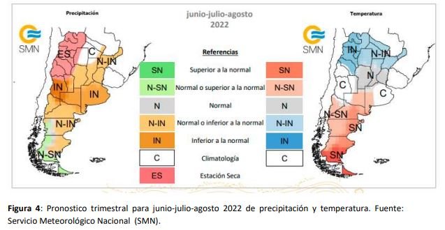 En cuanto a las tendencias climáticas para el trimestre junio julio agosto, publicada el 27 de mayo por el SMN, indica que para nuestra zona las precipitaciones serán normales o inferiores a lo normal y las temperaturas para el sur de Santa fe serán normales (Figura 4).