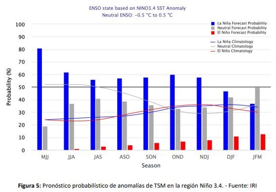 región Niño 3.4 publicado por el IRI el 19 de mayo 2022 para el trimestre junio-julio-agosto 2022 (JJA), hay 62% de probabilidad de que se mantengan las condiciones Niña. Las probabilidades de Niña se mantendrían durante el invierno (Figura 5).