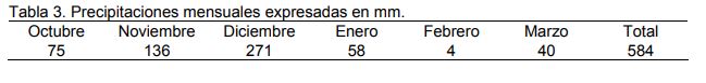 Las precipitaciones totales durante el periodo octubre-marzo fueron de 584 mm (tabla 3), Caracterizándose la campaña 2017/2018 por presentar elevadas precipitaciones durante los meses de noviembre y diciembre, siendo escasas durante enero, febrero y marzo.