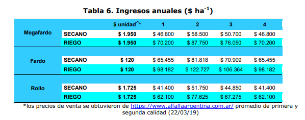 El Valor Actual Neto (VAN, 30%) para la opción de fardos en secano es 49.370 $ ha-1 , mientras que si la alfalfa se riega el VAN es de 60.133 $ ha-1 .