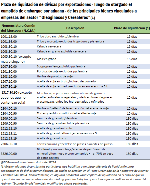 Por último, es menester mencionar que desde los cambios normativos instaurados en septiembre de 2019 (Decreto N° 609/2019 y su modificatoria Decreto N° 91/2019), se establece que el contravalor de la exportación de bienes y servicios oficializadas a partir del 2/09/2019 deben ser ingresados al país en divisas y/o negociarse en el mercado de cambios en las condiciones y plazos establecidas por el BCRA. De esta manera, según el Texto Ordenado de las normas sobre “Exterior y Cambios” actualizado recientemente el 28 de mayo de 2021, se especifica que el valor facturado según la condición de venta pactada, deberá ingresarse al país y liquidarse en el mercado de cambios en el plazo de 15 días luego de que se obtiene el cumplido de embarque otorgado por la Aduana para los principales bienes exportados por el sector “Oleaginosos y Cerealeros”. Tal situación rige, excepto para el caso de exportaciones del complejo girasol y biodiesel, para los cuales se establece un plazo de liquidación de 180 días respectivamente.