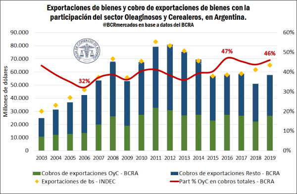 Tomando en consideración la sectorización del BCRA, es de interés reflejar la importancia que adquiere el principal sector agroindustrial “Oleaginosos y Cerealeros” en la liquidación de divisas/cobros de exportaciones en dichos períodos mencionados.