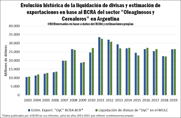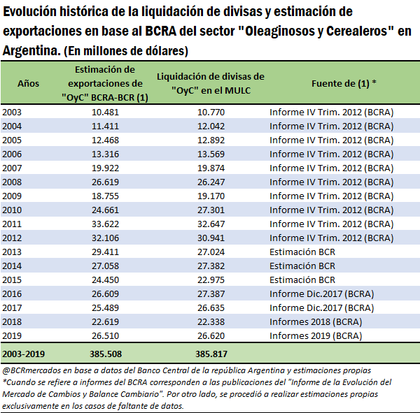 Comparación de las exportaciones de “Oleaginosos y Cerealeros” estimadas por el BCRA en sus informes mensuales del Balance Cambiario versus la liquidación de divisas por cobros de exportaciones del mencionado sector en dicho informe en el período 2003-2019. El acumulado de liquidación de divisas arriba a U$S 385.817 millones