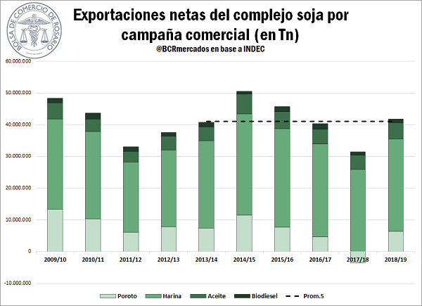 La recuperación productiva sumada al perfil fuertemente exportador que tiene el complejo oleaginoso argentino dieron lugar a que la campaña 2018/19 finalizara con un volumen neto exportado de 41,9 millones de toneladas de productos derivados de la soja (incluido el poroto de soja). Cabe aclarar que este resultado es en términos netos, ya que se descuentan las 3,8 Mt de poroto de soja que se importaron desde Paraguay. Importar soja del país vecino se transformó en una práctica frecuente en los últimos años, ya que al tener un mejor contenido proteico permite producir una harina de mayor valor agregado cuando se mezclan los porotos paraguayos y argentinos antes de ser procesados en las fábricas aceiteras. De todos modos, las exportaciones brutas del complejo ascendieron a 45,7 Mt.