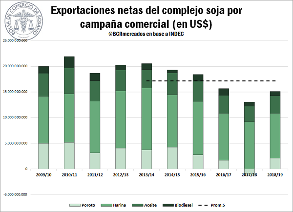 En términos monetarios, los despachos del complejo soja durante toda la campaña 2018/19 permitieron al país un ingreso neto de divisas de 15.123 millones de dólares. Si bien este monto supera por US$ 3.400 millones al del ciclo anterior, se posiciona por debajo del promedio de las últimas cinco campañas comerciales, que se ubica en US$ 17 mil millones. Además, representa el segundo valor neto exportado más bajo en la última década, sólo superando al del ciclo 2017/18. Esto se debe al deterioro de los precios de exportación de la mayoría de estos productos, que a continuación se analizarán uno por uno.