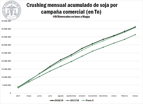 En total, a lo largo de toda la campaña 2018/19 se procesaron 41,2 millones de toneladas de soja. Este volumen no sólo implicó un aumento interanual del 13,3%, sino que también permitió que la cantidad procesada de la oleaginosa se posicionara un 0,9% por encima del promedio de las últimas cinco campañas, de 40,8 Mt.