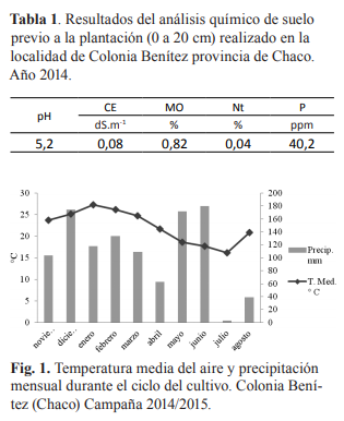 El trabajo se llevó a cabo en la localidad de Colonia Benítez, provincia del Chaco, a 27° 25’ latitud sur y 58° 56’ longitud oeste a 54 metros sobre el nivel del mar. La plantación se realizó el 6 de noviembre de 2014, con ramas seleccionadas de una plantación realizada en la campaña 2013/2014, las estacas de 15 cm de longitud se cortaron del tercio medio de las ramas descartándose el resto, las mismas no recibieron tratamiento sanitario y en la plantación fueron colocadas en posición horizontal. El clima es subhúmedo – húmedo, templado (Subtropical), con inviernos moderados y relativamente secos (Ledesma y Zurita, 1995) y según la clasificación de Köppen el sector oriental de la provincia del Chaco es clasificado como (Cf) que corresponde a Climas Templados Húmedos (Strahler y Strahler, 1997; De Fina y Ravelo, 1985), y según Bruniard (2000), el clima es de Bosque abierto y Parque semideciduo subtropical. El suelo sobre el que se cultivó, está clasificado como Argiudol típico y corresponde a la serie Resistencia (Ledesma y Zurita, 1995). En la Tabla 1 puede observarse el resultado del análisis químico de suelo realizado a una profundidad de 0 a 20 cm y en la Figura 1, la variación de la temperatura media y la distribución de los 1070 mm de lluvia, durante el ciclo del cultivo. Para la identificación de los cultivares de mandioca se utilizó el mismo nombre con el que fueron recolectados agregándose una letra al final que hace referencia al lugar de colecta, quedando definidos diez materiales: Campeona L, Blanca astada, Verde L, Pombero J, Campeona B, Verde J, Misionera L, Pombero negra, Yeruti y Blanca J. El marco de plantación utilizado fue de 1 metro por 1 metro, lo que determina 10.000 plantas por hectárea. Las unidades experimentales fueron de 15 m2 , formadas por 4 hileras con 6 plantas por hilera. El control de malezas se realizó en forma mecánica, con cultivador en el entre surco y con carpidas manuales en el linio. No se hicieron fertilizaciones. La cosecha se efectuó a los 10 meses, determinándose para cada material peso fresco bruto (PFB) y comercial (PFC) de raíces, para ello se descartaron las raíces deformes, las menores a 2,54 cm de diámetro y con menos de 20 cm de longitud. También se contaron número de raíces totales (NRT) y comerciales (NRC) y el porcentaje de almidón según la metodología de Toro y Cañas, (1983). El diseño experimental empleado fue en bloques completos al azar compuesto por 10 tratamientos que fueron los cultivares de mandioca en sí mismos y 4 repeticiones. Con los datos se realizó análisis de varianza y comparación de medias con la prueba de Tuckey al 5% usando el software INFOSTAT (Di Rienzo et al., 2008).