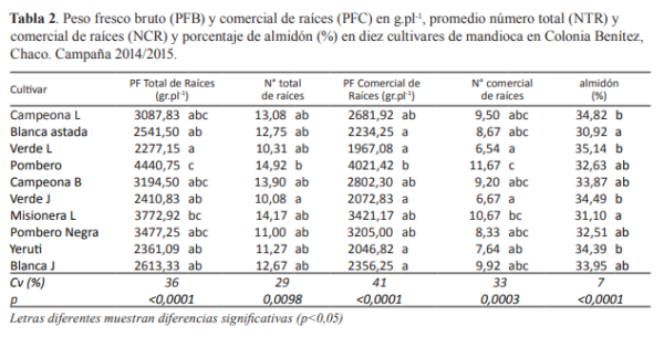Tal el caso del cultivar Pombero segundo lugar el Msionera L que no solo presentarían aptitud para el consumo en fresco sino también para abastecer a la industria dadas sus producciones totales de raíces individuales