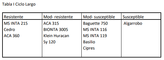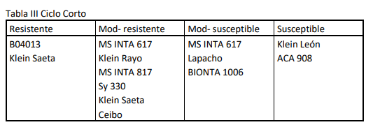 Este trabajo pudo evaluar variedades de distinto ciclo, encontrándose diferencias en el nivel ataque El uso de éstos materiales resistentes o moderadamente resistentes, podría evitar pérdidas de rendimiento bajo condiciones predisponentes o el uso necesario de agroquímicos que elevan el costo del cultivo. La mayor resistencia genética presentada por algunas variedades alienta a continuar la búsqueda de materiales de buen comportamiento.