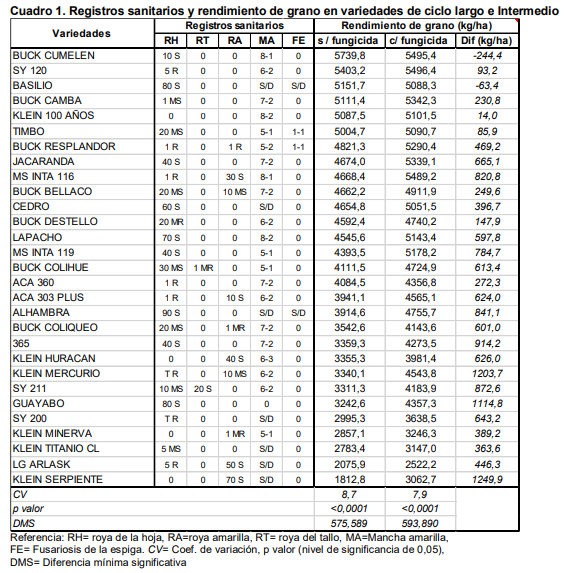 La información del cuadro 1 permite ver que hubo diferencias estadísticas significativas (p<0,05) ><0,05) entre las variedades en rendimiento de grano en ambos tratamientos (con y sin control químico de enfermedades). La resistencia genética o tolerancia a enfermedades sumado a otras condiciones productivas intrínsecas de las variedades, fueron factores responsables de las diferencias observadas. 21% de las variedades mostraron rendimientos superiores a 5000 kg/ha, 34,5% entre 4000 y 5000 kg/ha, 27,6% entre 3000 y 4000 kg/ha y 17,2 % con rendimientos inferiores a 3000 kg/ha. Con control químico de enfermedades se observaron mayores rendimientos logrados acortando las diferencias entre las variedades. Hubo un 41,4% de variedades con rendimiento superior a 5000 kg/ha, 38% con rendimientos entre 4000 y 5000 kg/ha y 17,2% de las variedades con rendimientos inferiores a 4000 kg/ha. Las respuestas al control químico se muestran en la columna “Dif. kg/ha”. A excepción de 8 variedades con respuestas negativas o mínimas (menor a 300 kg/ha), el resto mostró ganancias de rendimiento por encima de 300 kg/ha. Las diferencias máximas observadas fueron de más de 1100 kg/ha. En la mayoría de los casos la presencia de enfermedades resultó ser la causa de tales diferencias.