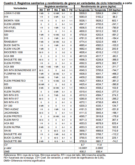El cuadro 2 muestra que, en el grupo de variedades de ciclo intermedio a corto, existieron difirieron estadísticamente (p<0,05) entre sí en rendimiento de grano en ambos tratamientos (con y sin control químico de enfermedades). Se observó menor presión de roya de la hoja, comparado a las variedades sembradas en primera fecha, observado en menores registros de severidad. En cambio, roya amarilla se observó en esta fecha más generalizada sobre las variedades, con similares niveles de severidad a los registrados en la primera fecha de siembra. Los niveles de infección de mancha amarilla fueron similares a los observados en las variedades de primera fecha de siembra. Los valores de rendimiento de grano, que se observan en el tratamiento sin control químico, muestran menores diferencias entre variedades. El 81% de las variedades alcanzaron rendimientos entre 4000 y 5000 kg/ha. Sobre este grupo de variedades se observó menores respuestas frente al control químico. El 59,5 % de las variedades presentó respuestas negativas a la aplicación de fungicidas, en tanto que el 22% mostró diferencias en rendimiento inferiores a 300 kg/ha y un 19% de las variedades con diferencias de rendimiento superior a este valor.
