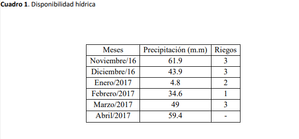 Previo a la siembra, la semilla fue tratada con una mezcla de insecticida Imidacloprid más inoculante Rizopack 212 de Rizobacter Argentina. La dosis empleada para 50 kg de semilla, fue de 50 cc. de insecticida + 150 ml Rizo-liq Top + 50 ml de Premax-R + 50 ml de Maxim xl. La siembra se realizó el 10 de noviembre, registrándose la emergencia el 18 de noviembre. La densidad de plantas utilizada estuvo entorno a las 400 mil pl/ha. Para el control de malezas, se aplicó herbicida Glifosato a razón de 2,5 lt/ha el 2 de diciembre repitiendo la misma el 4 de enero. En lo que respecta al control fitosanitario, el 4 de enero se efectuó una aplicación de clorpirifoscipermetrina mas Tiametoxam-Lambdacialotrina, repitiendo el control el 11 de enero, con Deltametrina mas Clorpirifos. La disponibilidad hídrica registrada durante el desarrollo de la experiencia se detalla en el siguiente cuadro: