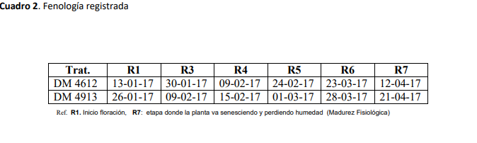 En esta campaña, la ocurrencia de la primera helada se registró el día 22 de Mayo. Esta situación excepcional permitió que las variedades lograsen alcanzar R8 sin ser afectadas en su desarrollo. No obstante, para la zona el riesgo de heladas se manifiesta mucho antes, en el mes de abril, alcanzando a las plantas en un momento más sensible de su desarrollo.