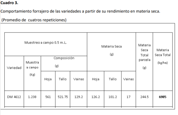 Analizando el cuadro, observamos un mayor rendimiento para la variedad DM 4913. Esta diferencia de aproximadamente 1000 Kg MS/ha, nos estaría indicando una tendencia superior de variedades de grupo de madurez alto. Esta observación es confirmada por experiencias de campañas anteriores (2013-14, 2014-15) donde se observaron variedades de grupos de madurez altos V, VI y VII con rendimientos entorno a las 9 tn/MS/ha. Con la densidad de siembra empleada (24 pl/m.lineal) DM 4612 manifestó un 30% de vuelco, alcanzando un metro como altura promedio, con 2,5 ramificaciones por planta asociadas estas características a un buen estado sanitario. DM 4913 manifestó un 50% de vuelco, alcanzando un metro como altura promedio y 6 ramificaciones por planta. Estas determinaciones que se muestran en el cuadro 3, son las que nos posibilitan seleccionar la variedad, de acuerdo al momento y destino de utilización de lo que consideramos como oferta forrajera.