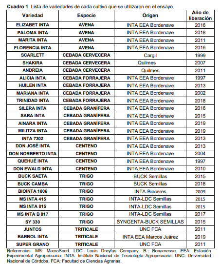 Los cereales invernales comprenden una gran cantidad de especies y cultivos teniendo cada uno una mejor adaptación o comportamiento a un ambiente determinado. Son muy importantes para la sustentabilidad ambiental en todos los sistemas de producción. Se utilizan mucho para consumir el agua en el perfil del suelo y contrarrestar el ascenso de la napa freática y utilizar este recurso agua para la producción de forraje y granos y también como cultivo de servicio para cobertura de suelos y control de malezas. Estas diferentes alternativas de usos le dieron a las gramíneas tener mayor protagonismo en las rotaciones agrícolas. En este sentido, el presente informe tiene como objetivo actualizar el panorama varietal y el comportamiento productivo en cuanto al rendimiento de grano de avena, cebada forrajera, cebada cervecera, cebada granífera, centeno, triticale y trigo en la zona de influencia de la EEA Marcos Juárez.