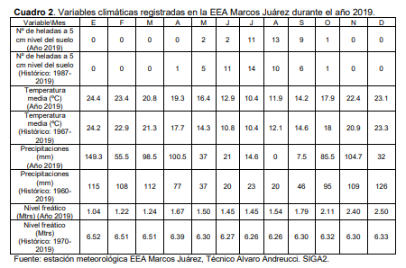 Durante la campaña agrícola 2019 en la zona de influencia de la EEA Marcos Juárez para los cultivos de invierno se inició con una muy buena disponibilidad de agua en el perfil del suelo con motivo de las altas precipitaciones ocurridas en los meses estivo-otoñales (cuadro 2), en la cual, en la mayoría de los meses con milimetrajes superando al promedio histórico. Esta disponibilidad de agua en el perfil del suelo al momento de la siembra garantizó una muy buena emergencia e implantación de todos los materiales a evaluar. En el mes de julio llovieron 15 milímetros, ayudando a seguir recargando el perfil y generando óptimas condiciones para el macollaje de todos los cultivos a evaluar.