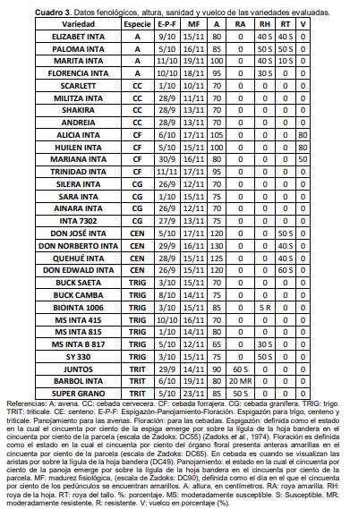 En el cuadro 3 se visualizan los datos fenológicos (espigazón-panojamiento-floración y madurez fisiológica), altura de planta, comportamiento sanitario y vuelco de las variedades evaluadas. Con respecto a la espigazón-panojamiento-floración, en general ocurrieron en una época favorable (fin de septiembre y principios de octubre) y en forma pareja teniendo en cuenta la cantidad de variedades evaluadas y la diversidad de cultivos. Las variedades más precoces resultaron ser las cebadas graníferas (SILERA INTA y AINARA INTA) y el centeno DON EWALD INTA, floreciendo y espigando, respectivamente el 26 de septiembre. MARITA INTA (avena) y TRINIDAD INTA (cebada forrajera) fueron las variedades de ciclo más largo del ensayo.
