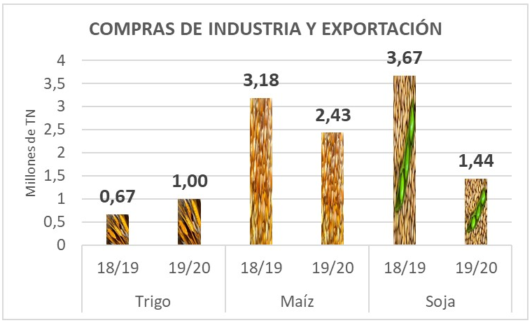 En el gráfico vemos los volúmenes comprados por la industria y exportación de los tres granos, y para las dos campañas, la actual 18/19 y la entrante 19/20.