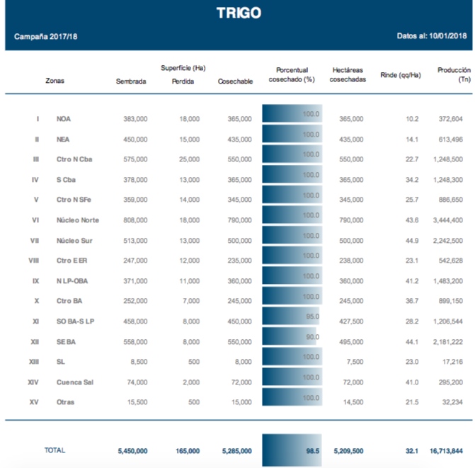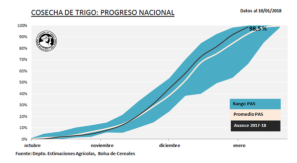 La cosecha de trigo registró un avance intersemanal de 6,9 puntos porcentuales, restando la recolección de 75.000 hectáreas que se concentran en el sur de Buenos Aires y La Pampa. A su vez, al presente informe se dan por finalizada las labores de recolección en el Norte de La Pampa-Oeste de Buenos Aires, Centro de Buenos Aires y Cuenca del Salado.