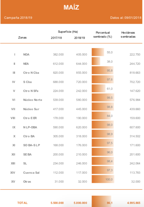 Durante los últimos siete días, la incorporación de cuadros de maíz con destino grano comercial continuó en toda el área agrícola nacional. Las lluvias registradas durante este período permitieron mantener las reservas hídricas, pero al mismo tiempo generaron demoras en los avances de siembra. Por otro lado, aún restan sembrar los últimos cuadros de segunda ocupación de los Núcleos Norte y Sur. El avance a la fecha se ubica en el 86,1 %, con casi 5 MHa incorporadas a lo largo del país. Frente a este panorama mantenemos la proyección de siembra con destino grano comercial en 5.800.000 Ha.