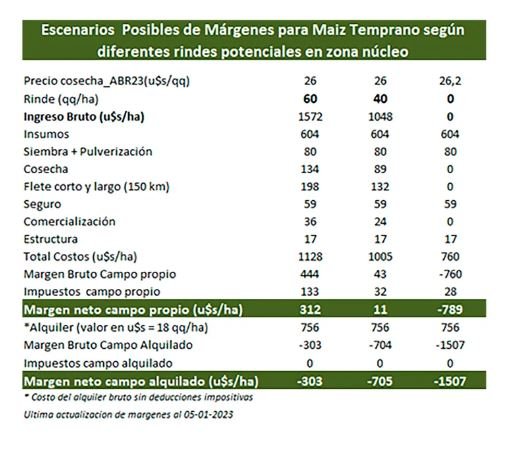 Para la BCR, bajo la condición de alquiler se necesitan cosechar al menos 38 qq/ha, para que el productor obtenga una ganancia. Pero las pérdidas son de USD97/ha, si la cosecha rinde 35 qq/ha; de USD422/ha, con un rendimiento de 25 qq/ha, y de USD747/ha si rinde 15 qq/ha. En tanto, en campo propio los resultados son positivos para los rendimientos de 35 y 25 qq/ha, pero no para los de 15 qq/ha.