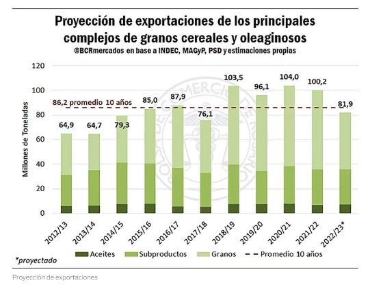 Esta situación impacta gravemente en la actual campaña agrícola. Según la Bolsa de Comercio de Rosario (BCR), la siembra de todos los granos abarcará unos 39,3 M/ha, superficie que representaría una caída del 2% respecto del ciclo anterior, y con una cosecha total de cereales y oleaginosas estimada en 117,7 M/t, volumen que implica una caída 15,3 M/t y 12% en la comparación interanual. En tanto las exportaciones que proyecta la BCR rondan los 45,9 M/t, equivalentes a una merma del 27%, respecto de 2022.