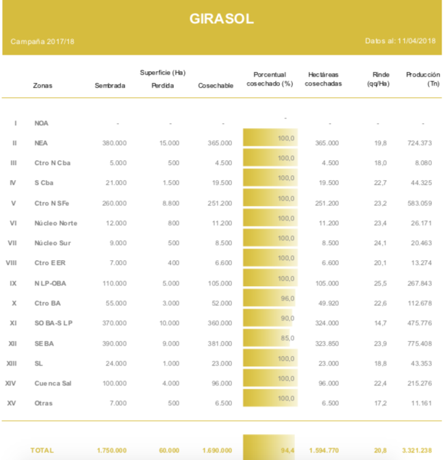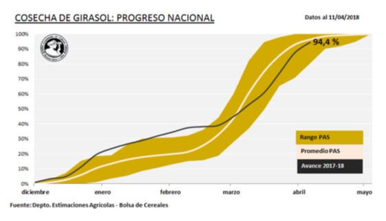 Durante la última semana, las labores de recolección de girasol se concentraron sobre las regiones del centro y sur del área agrícola nacional. La superficie cosechada ascendió a 1,6 millones de hectáreas con un rinde medio que descendió 0,2 qq/Ha. A su vez, se dio por finalizada la cosecha de la oleaginosa en el Norte de La Pampa-Oeste de Buenos Aires y en la Cuenca del Salado. De esta manera, el área remanente se concentra en su totalidad en el centro, sudeste y sudoeste de Buenos Aires, y en el sur de La Pampa, donde la cosecha mantiene un leve retraso en comparación a la campaña 2016/17.