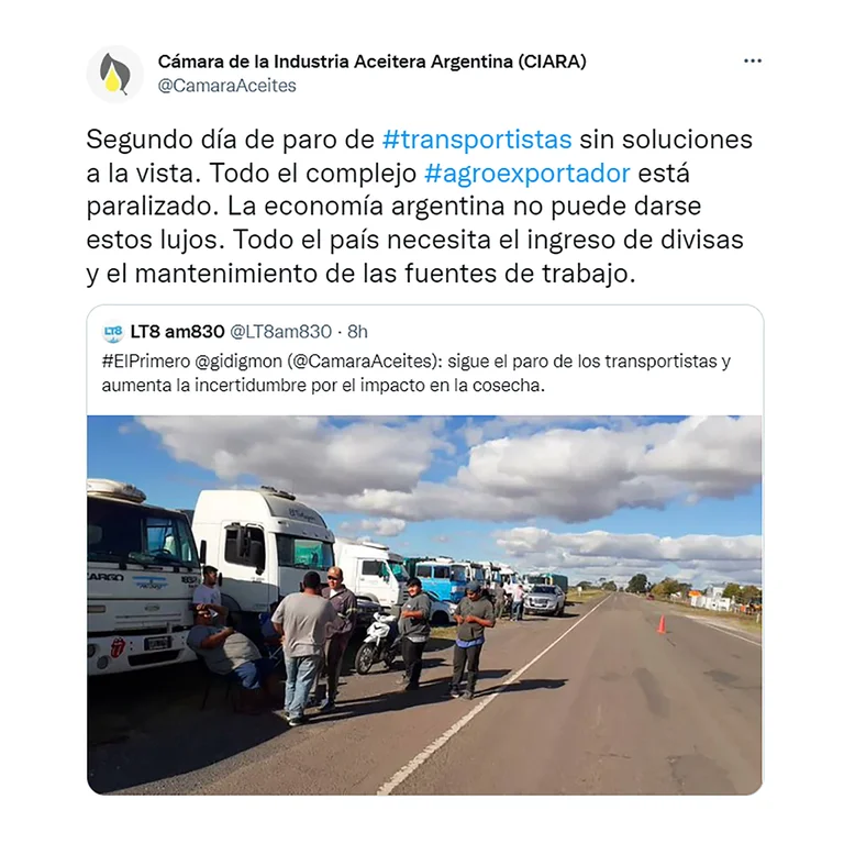 “Segundo día de paro de transportistas sin soluciones a la vista. Todo el complejo agroexportador está paralizado. La economía argentina no puede darse estos lujos. Todo el país necesita el ingreso de divisas y el mantenimiento de las fuentes de trabajo”, publicó Ciara-CEC en su cuenta de Twitter.