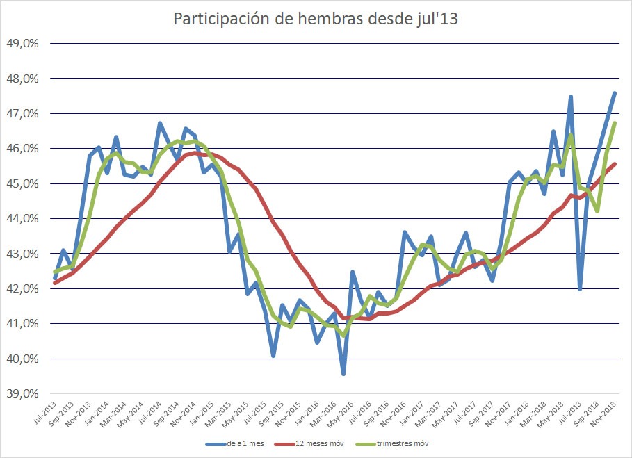 No obstante, no debe dejar de señalarse que en la trayectoria de a 12 meses móviles, la participación de hembras está muy próxima al pico de fines de 2014.