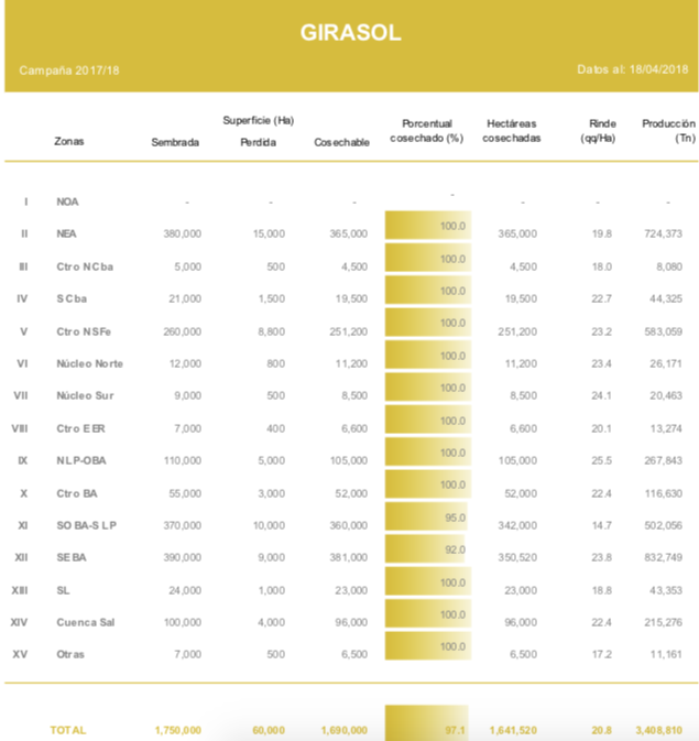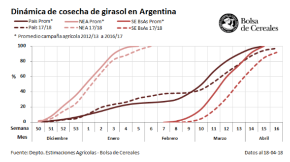 Restando los últimos lotes por recolectarse en el sur de Buenos Aires y La Pampa, la cosecha de girasol avanzó 2,8 puntos porcentuales y acumuló un volumen parcial superior a los 3,4 millones de toneladas. Las productividades semanales registraron una leve disminución como consecuencia de un mayor impacto de la sequía sobre los lotes implantados en fechas más tardías.