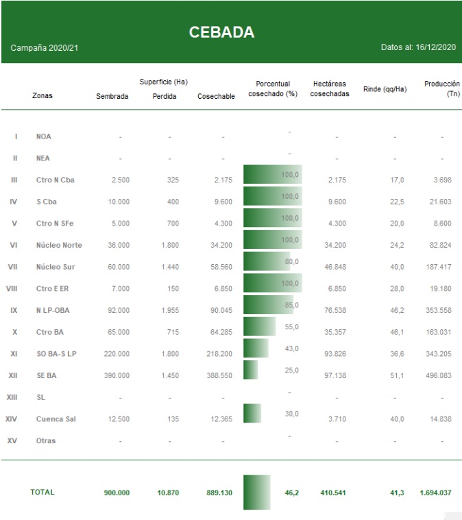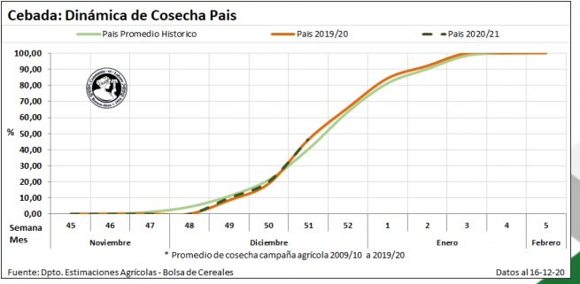 Durante los últimos 15 días, las labores de recolección cobraron fluidez sobre el centro y algunos sectores del sur del área agrícola. La ausencia de precipitaciones permitió registrar un avance interquincenal de 36 puntos porcentuales, elevando el progreso de cosecha de cebada al 46,2 % del área apta. Rindes por encima de las estimaciones iniciales sobre el centro y sur del área agrícola amortiguan las mermas del norte y permiten afirmar la proyección de producción de 3.700.000 toneladas sin descartar futuros incrementos.
