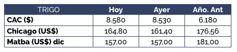 Durante la rueda de la jornada de hoy, las empresas exportadoras ofrecieron US$ 180/t por el trigo con descarga, mismo valor que ayer. Sin embargo, la oferta se encuentra alejada de estos valores por lo que quienes quieran adquirir la mercadería deberán pagar precios superiores. En el segmento forward, los valores propuestos para las entregas en junio y julio próximos se situaron en 175 y 170 dólares por tonelada, respectivamente, sin cambios respecto a la última rueda. Por la cosecha nueva, los ofrecimientos alcanzaron los US$ 155/t para la entrega entre el 15 de noviembre y el 15 de diciembre, los US$ 158/t para la descarga entre el 15 de diciembre y fin de enero, los US$ 156/t para febrero y los US$ 160/t para marzo del próximo año.