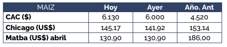 En la rueda de hoy, el valor abierto propuesto por la exportación para el maíz se situó en $ 6.150/t con descarga hasta fin de mes, cayendo 50 pesos en relación a la rueda de ayer. Sin embargo, según lo reflejado en las operaciones informadas, llegaron a pagarse hasta $ 6.400/t para las entregas cortas. En el segmento de negociaciones forwards, los precios volvieron a presentar mejoras, los mismo se ubicaron en US$ 133/t para junio, en US$ 130/t para julio/agosto, US$ 132/t para septiembre, en US$ 135/t para octubre, en US$ 137/t para noviembre y en US$ 138 para diciembre. Más allá de esto, se observan operaciones informadas para la entrega en junio y julio por US$ 135/t.