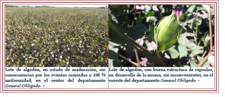 este. Continuó el monitoreo de los lotes, para la detección de los daños del picudo, sobre todo en los lotes en floración. En los predios más avanzados con apertura de capullos, deberían reactivarse las trampas para su detección y la realización de las acciones correspondientes, que además de la captura de los picudos permitirían la reducción de la población para la próxima campaña. En las zonas más castigadas climatológicamente fueron evaluándose los lotes afectados por las precipitaciones, para el análisis de los rebrotes y si ellos llegarían a la fructificación. En caso contrario se deberían destruir los cultivares para no posibilitar que se transformen en hospederos del picudo.