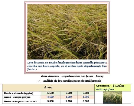 El proceso de cosecha se fue normalizando lentamente, alcanzándose un progreso del orden del 20 % de lo implantado, lo que representó 6.400 ha. Manteniéndose la mejoría enunciada en el informe anterior en los rendimientos promedios, los cuales fluctuaron entre 5.500 y 6.000 kg/ha. No se observaron problemas sanitarios en función de la excesiva humedad. Las temperaturas y buena luminosidad que se registraron en la semana continuaron brindando condiciones ambientales para el sostenimiento de la mejoría en arroces de media estación. El gran problema fueron las dificultades ya enunciadas, en la logística del acarreo del grano a las plantas de secado, acondicionamiento y el traslado del cereal a los molinos. Situación que estaría presente durante toda la cosecha y fin de campaña. Los estados fenológicos en que se encontraron los cultivares fueron desde la floración, llenado de grano y hasta madurez fisiológica. No hubo operaciones comerciales de importancia, solo los molinos chicos compraron partidas para el abastecimiento del cereal de la nueva cosecha a sus clientes. El valor comercial del grano de arroz con cáscara, fue de $ 7,00 /kg quedando igual al de las semanas anteriores.