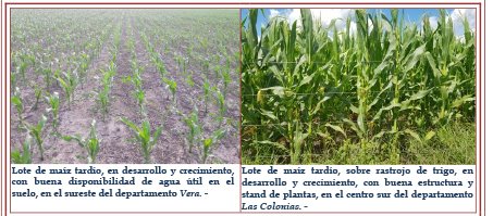 Un 90 % de los cultivares se encontraron en estado bueno a muy bueno, un 8 % afectado por los excesos hídricos, con ciertos grados de recuperación debido a las condiciones climáticas de la semana y un 2 % con consecuencias irreparables. Los cultivares continuaron bajo condiciones óptimas de humedad y temperatura su desarrollo y crecimiento, sin inconvenientes ni problemas sanitarios. En las áreas de influencia de las cuencas lecheras, muy lentamente prosiguieron las tareas de picado de cultivares, con buenos resultados en cuanto a calidad y cantidad, de acuerdo a los estados fenológicos. Se observaron los siguientes estados: estado 2 (5° hoja totalmente extendida), estado 3 (diferenciación de meristemas), estado 4 (hoja bandera visible), estado 5 (estado de bota o buche), estado 6 (floración), estado 7 (grano lechoso) y los más avanzados en estado 8 (grano pastoso).