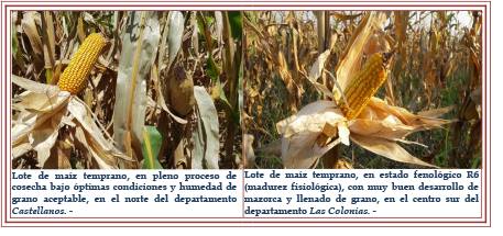 Las condiciones ambientales permitieron que el proceso de cosecha continuara y avanzara a ritmo lento y sostenido en todos los departamentos, hasta el domingo 24 del corriente. La inestabilidad y posteriores precipitaciones interrumpieron dicha actividad. Lo cosechado se hizo con humedad del grano aceptable, manteniéndose los rendimientos y obteniéndose en los: • departamentos General Obligado y Vera rendimientos promedios máximos que fluctuaron entre 50 – 65 qq/ha y mínimos de 35 a 40 qq/ha. Destancándose en el primero de ellos rendimientos de hasta 95 qq/ha. • departamentos San Justo, San Javier, Las Colonias, Castellanos, La Capital y San Cristóbal rendimientos promedios 70 – 80 a 95 qq/ha, con un máximo de 105 qq/ha. Destancándose en el primero de ellos rendimientos de hasta 140 qq/ha. • departamentos San Martín y San Jerónimo, comenzaron a registrarse los primeros rindes y los mismo fluctuaron entre 95 – 100 – 110 qq/ha, con un máximo de 115 qq/ha. Se estimó que el rendimiento promedio sería de 86 a 88 qq/ha, superior en 10 a 11 qq/ha, al obtenido la campaña anterior. Los cultivares con destino a grano comercial, un 90 %, presentaron un muy buen estado a excelente y el 8 % restante regular, el cambio o variación de un punto a estado regular fue consecuencia de los grados de impacto del paso del último frente de tormenta y a ráfagas de viento, que han provocado el volteo y caída de plantas en distintos sectores de los departamentos del centro provincial. Se observaron, los siguientes estados fenológicos: R “estados reproductivos”, en un bajo porcentaje en R5 (grano dentado) y el resto de porcentaje, en R6 (madurez fisiológica).