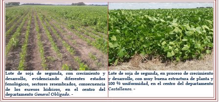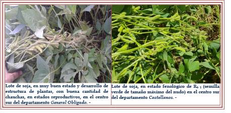 la producción. Se observó un 80 % los cultivares en estado bueno a muy bueno, con lotes excelentes, un 8 % en estado bueno a regular y el 12 % restante, en estado regular a malo, manifestando el impacto y los inconvenientes sufridos, especialmente en las áreas deprimidas y bajas topográficamente. La condición sanitaria, hasta la fecha, no ha presentado inconvenientes, desarrollándose todo bajo controles de monitoreo y seguimiento. Se observaron, los siguientes estados fenológicos: R “estados reproductivos”, R1 (inicio de floración), R2 (floración con uno de los nudos superiores con hojas desarrolladas), R3 (vaina de 5 mm de longitud en nudo), R4 (vaina de 20 mm de longitud en nudo), R5 (comienzo de llenado de semilla en nudo, semilla de 3 mm de longitud) y lotes más avanzados en R6 1 (semilla verde de tamaño máximo del nudo).