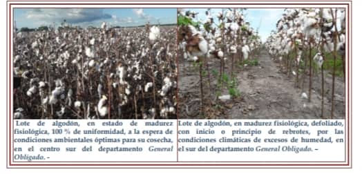 Los altos porcentajes de humedad ambiente en un principio y luego el progresivo aumento de las condiciones de inestabilidad climática, generaron una disminución importante hasta la detención de las actividades en el área algodonera, principalmente en el proceso de cosecha y en menor proporción el de la aplicación de defoliantes. Lote de arroz, con buena uniformidad de lote y desarrollo de plantas, a la espera de mejores condiciones climáticas y así ser cosechado, en el departamento San Javier. La tarea de recolección estuvo afectada, ya que los lotes defoliados y listos para la cosecha, ante la inestabilidad, comenzaron su rebrote y en algunos casos a deteriorarse las cápsulas. En la zona este algodonera, el avance de la recolección se concretó en un 62 %, hasta la fecha. Los rendimientos registrados en la zona se mantuvieron muy similares a los enunciados la semana anterior, ampliándose la diferencia entre los mínimos que fueron de 17 – 18 qq/ha y los máximos de 34 – 36 qq/ha. Continuó observándose que los rindes mínimos, de esta campaña, disminuyeron su promedio en 7 qq/ha, reflejando el impacto de las excesivas precipitaciones por los eventos climáticos ocurridos a fines del mes de enero y febrero de 2019. Muy importante sería la destrucción de los rastrojos después de la cosecha, para que no haya rebrotes de las plantas, evitando así, la reproducción de picudos. Se recuerda que la fecha límite de destrucción de los rastrojos del cultivo, sería el 31 de mayo para la zona este y el 15 de junio para la zona oeste. En el área algodonera oeste, la realidad continuó siendo muy compleja y sin actividades en todo el período ante las condiciones climáticas desfavorables y la imposibilidad de la realización de actividades específicas. Recordando que el proceso de cosecha logrado hasta la fecha fue del orden del 10 %, los rendimientos promedios mínimos fueron de 10 – 12 qq/ ha y los promedios máximos de 20/21 qq/ha, con partes de lotes puntuales de 25 – 26 qq/ha. Se observaron los siguientes estados fenológicos: en R “estados reproductivos” desarrollo de cápsulas, M “maduración”, M1 (primer cápsula abierta), M2 (60 % de cápsula abierta) y madurez fisiológica.