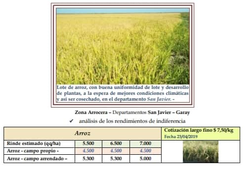 Los rendimientos promedios se mantuvieron y fluctuaron entre 5.400 a 5.600 kg/ha, en la variedad de arroz largo fino y 4.100 a 4.300 kg/ha, en la variedad de arroz largo ancho. La caída o disminución de la calidad del grano y la cantidad de kg/ha, se acentuó, por el atraso en la maduración de los mismos y lo avanzado del período. El estado fenológico en que se encontraron los cultivares fue de madurez fisiológica.