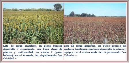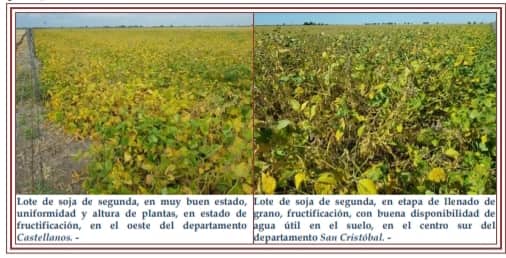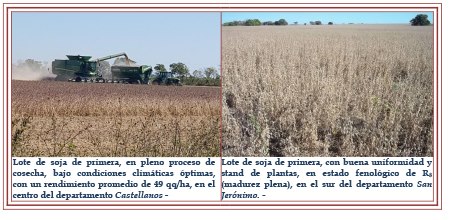 El proceso de cosecha del cultivo fue avanzando desde los departamentos del sur hacia el norte, pero condicionado por las características de inestabilidad climática, que paralizaron totalmente el mismo. El grado de avance hasta la fecha fue del orden del 18 %, representando aproximadamente unas 90.450 ha, evidenciando un adelanto de 15 puntos, en comparación a la campaña pasada, para el mismo período. Los rendimientos mínimos fluctuaron entre 18 – 20 – 22 qq/ha, los máximos entre 38 – 40 – 42 qq/ha y en lotes puntuales de 45 qq/ha. El cultivo se encontró en un 65 % estado bueno, con sectores o áreas muy buenas y lotes puntuales a excelentes, un 22 % en estado regular y el resto un 13 % en estado regular a malo, con impactos y consecuencias directas por los eventos climáticos sufridos. Se observaron los siguientes estados fenológicos: R “estados reproductivos” R1 (inicio de floración), R2 (floración con uno de los nudos superiores con hojas desarrolladas), R3 (vaina de 5 mm de longitud en nudo), R4 (vaina de 20 mm de longitud en nudo), R5 (comienzo de llenado de semilla en nudo, semilla de 3 mm de longitud), R6 1 (semilla verde de tamaño máximo del nudo), R7 (comienzo de madurez, una vaina con color de madurez) y lotes más avanzados en R8 (madurez plena).