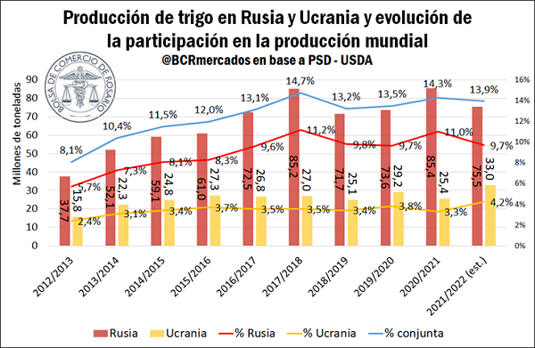 Desde la crisis de Crimea en 2014 hasta nuestros días, la región del Mar Negro ha aumentado sustancialmente su participación en los mercados agrícolas. Mientras en la campaña 2012/13 el trigo proveniente del Mar Negro representaba menos del 14% del comercio mundial, en esta campaña espera acercarse al 30%, lo que da más relevancia a los potenciales impactos de este conflicto. El incremento no sólo se ha observado en el comercio exterior, sino que la producción también ha crecido sustancialmente, pasando del 8% a casi el 14% del trigo a nivel global.