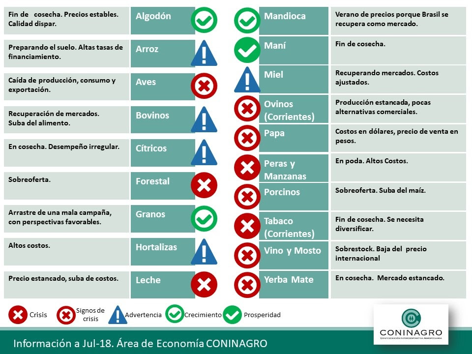 El Semáforo de las Economías Regionales que realiza CONINAGRO mensualmente, presentó en julio 10 sectores productivos con signos de crisis, dos menos que los registrados en junio, sobre un total de 19 actividades relevadas.