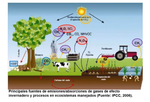 En agricultura se producen emisiones y secuestro de gases de efecto invernadero (GEI) como el óxido nitroso (N2O), el metano (CH4) y el CO2. La Huella de Carbono (C) de un sistema de producción – es decir la diferencia entre emisiones y secuestro de GEI – varía según el tipo de actividad y el manejo.