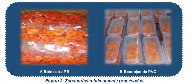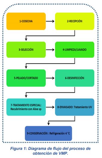 En los ensayos se observó que, durante los primeros 10 días de almacenamiento a 4°C, no hubo diferencias en los VMP tratados con UV y conservados en bolsa y bandejas de PE para las determinaciones fisicoquímicas de acidez, pH y sólidos solubles, ni incremento en los recuentos microbianos. Sin embargo, a partir de este tiempo comenzó a disminuir el contenido de carotenos. La vida útil fue de 14 días en bandejas y 24 días en bolsas para los VMP sin recubrimiento, mientras que la vida útil fue de 14 días en VMP con recubrimiento de Aloe sp en ambos envases.