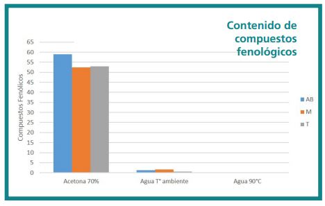 El gráfico refleja claramente cuáles son las especies que presentan una mayor cantidad de compuestos que podrían tener capacidad antioxidante, conocidos como compuestos fenólicos, respecto a los solventes empleados en la extracción.