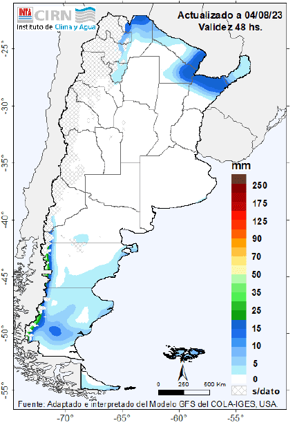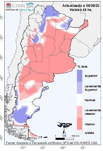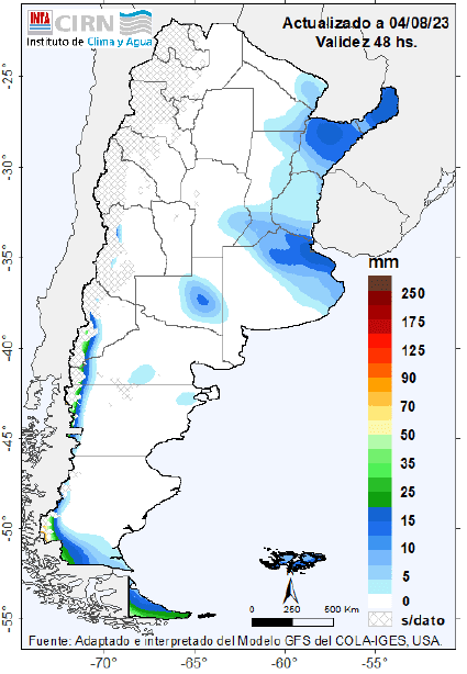 Las precipitaciones pronosticadas serían entre normales a superiores a las normales para la época sobre el Misiones, Corrientes, la región Pampeana (centro y este), La Pampa, Mendoza (oeste) y Patagonia (oeste y sur).
