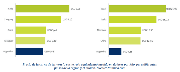 En segundo lugar, basta realizar una rápida comparación del precio en dólares de la carne vacuna en los principales países a los que exporta argentina para derribar de pleno dicha apreciación.
