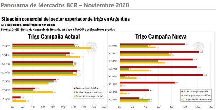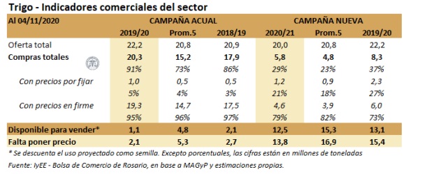 Campaña 2019/20: Con ventas declaradas al exterior del sector exportador por 12,33 millones de toneladas (Mt) y embarques estimados hasta fin de octubre de 11,63 Mt, se prevé que se despachen 700.000 tn en noviembre al exterior, dado que ya han comenzado a ingresar al puerto los primeros lotes del trigo 2020/21. En tanto, las compras de la cosecha actual del sector exportador por 15,52 Mt dan cuenta de un stock suficiente de mercadería para cumplir con los compromisos pactados, y aunque parte de esta disponibilidad de grano se ha volcado al mercado interno, el empalme entre cosechas ha comenzado sin mayores sobresaltos. Sin embargo, teniendo en cuenta los 4,73 Mt de grano que ya ha adquirido la molinería, la disponibilidad de grano para comercializar a comienzos del mes de noviembre es de 1,1 Mt, casi la mitad de los 2,1 Mt remanentes a la misma altura del año anterior y muy por detrás de los 4,8 Mt con los que se contaba en promedio durante los últimos cinco años. En este sentido, dicho tonelaje remanente representa unos US$ 238 millones de dólares en el mercado doméstico y US$ 316 millones en el mercado exportador.